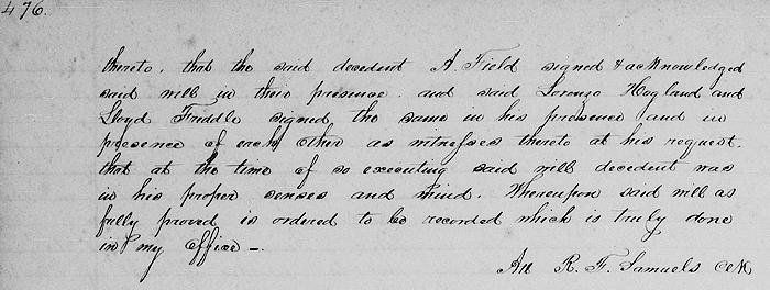 State of Kentucky, Bullitt County Court, 16 August 1852. This last will and testament of Abraham Field dec'd was this day produced in open court of said county for record, and said will was duly proved by the oaths of Lorenze Hogland and Lloyd Friddle, subscribing witnesses thereto; that the said decedent A. Field signed and acknowledged said will in their presence and said Lorenzo Hogland and Lloyd Friddle signed the same in his presence, and in the presence of each other as witnesses thereto at his request; that at the time of so executing said will decedent was in his proper senses and mind. Whereupon said will as fully proved is ordered to be recorded, which is truly done in my office. Att. R. F. Samuels, clerk.