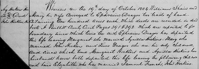Whereas on the 19th day of October 1804 William Shain and Mary his wife conveyed to Ephraim Dragoo two tracts of land containing one hundred acres each, which deeds are recorded in deed book A Bullitt County Court, pages 392 & 393 which are reported to for boundary, since which time the said Ephraim Dragoo has departed this life leaving Margaret who married Aquilla Hoskins, Mary who married John Hoskins, and Lewis Dragoo who are his only children.