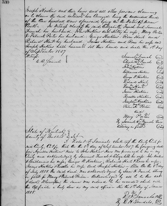 In witness whereof the said Elizabeth French and Samuel French her husband, John Hoskins and Kitty his wife, Mary Porter and Patrick Porter her husband, George Hoskins, Rose Hart and Richard Hart her husband, James Hoskins and Rose his wife and Joseph Hoskins hath hereunto set their hands and seals this 1st day of September 1857.