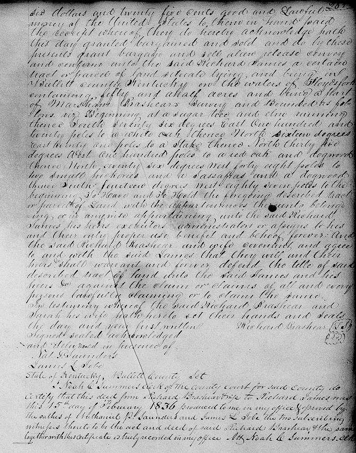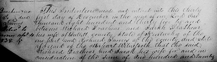 This indenture made and entered into this 31st day of December in the year of our Lord 1835 by and between Richard Brashear and Sarah Brashear his wife of Bullitt County, state of Kentucky of the one part and Richard James of the county and state aforesaid of the other part.