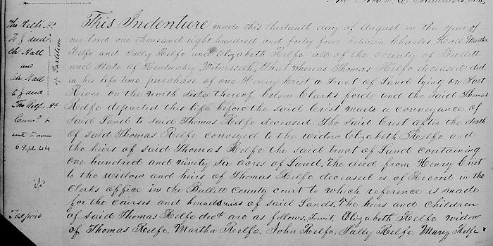 Witnesseth that whereas Thomas Relfe dec'd did in his lifetime purchase of one Henry Crist a tract of land lying on Salt River on the North side thereof below Clark's Ford, and the said Thomas Relfe departed this life before the said Crist made a conveyance of said land to said Thomas Relfe dec'd. The said Crist after the death of said Thomas Relfe conveyed it to the widow Elizabeth Relfe and the heirs of said Thomas Relfe the said tract of land containing 196 acres of land. The deed from Henry Crist to the widow and heirs of Thomas Relfe dec'd is of record in the clerk's office and the Bullitt County Court, to which reference is made for the courses and boundaries of said land.