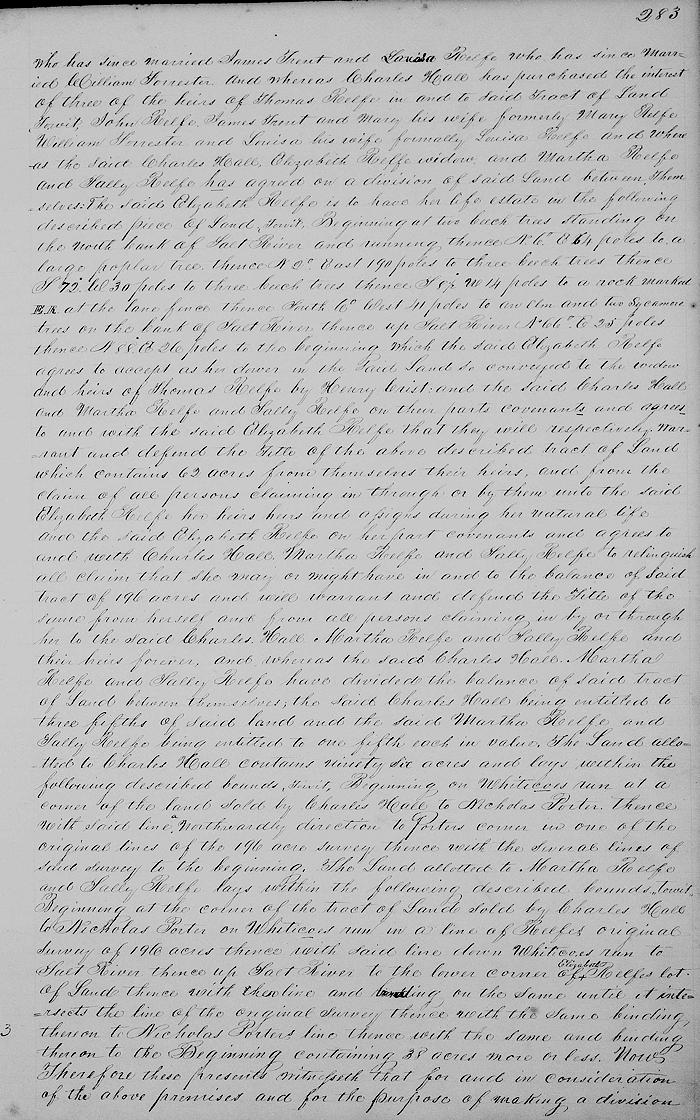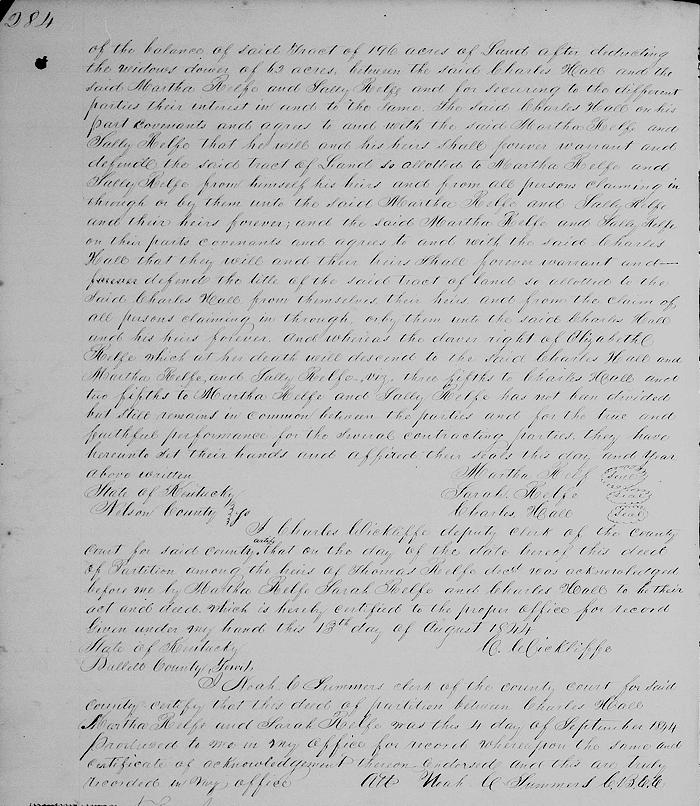 Now, therefore these presents witnesseth that for and in consideration of the above premises and for the purpose of making a division of the balance of said tract of 196 acres of land after deducting the widow's dower of 62 acres between the said Charles Hall and the said Martha Relfe and Sally Relfe, and for securing to the different parties their interest in and to the same, the said Charles Hall on his part covenants and agrees to and with the said Martha Relfe and Sally Relfe that he will and his heirs shall forever warrant and defend the said tract of land so allotted to Martha Relfe and Sally Relfe from himself, his heirs and from all persons claiming in throught or by them unto the said Martha Relfe and Sally Relfe and their heirs forever; and the said Martha Relfe and Sally Relfe on their parts covenant and agree to and with the said Charles Hall that they will and their heirs shall forever warrant and defend the title of the said tract of land so allotted to the said Charles Hall from themselves, their heirs, and from the claim of all persons claiming in through or by them unto the said Charles Hall and his heirs forever.