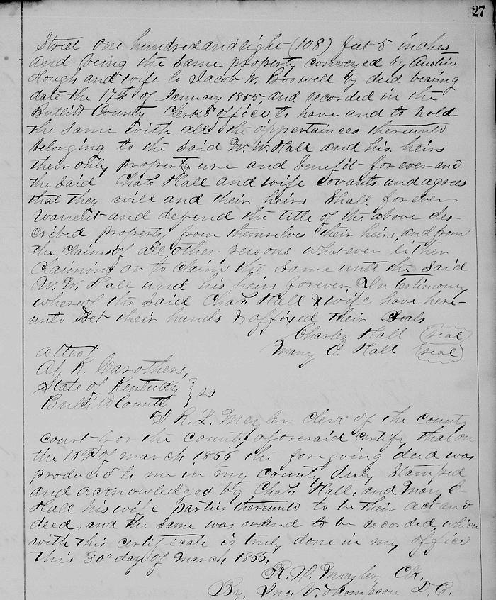 Witnesseth that for and in consideration of the sum of $100 to them in hand paid by W. W. Hall of the second part, the receipt whereof is hereby acknowledged, hath bargained and sold and by these presents doth grant, bargain and sell unto the said W. W. Hall and his heirs forever a certain lot in Mt. Washington lying on the south side of Main Street 84'10" known on the plot of said town by No. 78 and running back from said street 247'6"; also part of lot No. 74 fronting on Main and adjoining lot 78, the whole fronting on Main Street 108'5" and being the same property conveyed by Austin Hough and wife to Jacob N. Boswell by deed bearing date the 17th of January 1855 and recorded in the Bullitt County clerk's office.