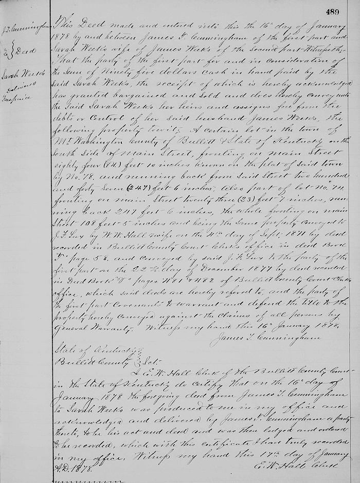 Also part of lot number 74 fronting on Main Street 23'7" running back 247'6", the whole fronting on Main Street 108'5" and being the same property conveyed to J. F. Lux by W. W. Hall and wife on the fourth day of September 1871 by deed recorded in Bullitt County Court clerk's office in Deed Book T, page 58, and conveyed by said J. F. Lux to the party of the first part on the 22nd day of December 1877 by deed recorded in Deed Book V, pages 481 and 482 of Bullitt County Court clerk's office, which said deeds are hereby referred to; and the party of the first part covenants to warrant and defend the title to the property hereby conveyed against the claims of all persons by general warranty. Witness my hand, the 16th of January 1878. (signed) James T. Cunningham
