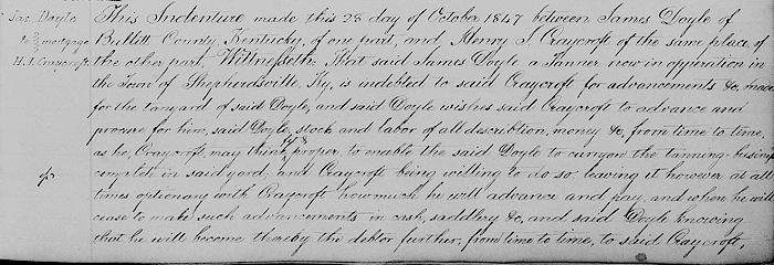 This indenture made this 28 day of October 1847 between James Doyle of Bullitt County, Kentucky of one part and Henry J. Craycroft of the same place of the other part.
