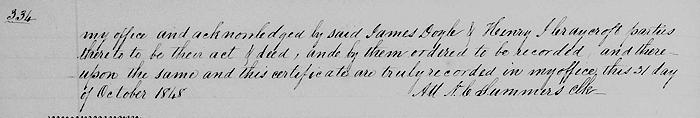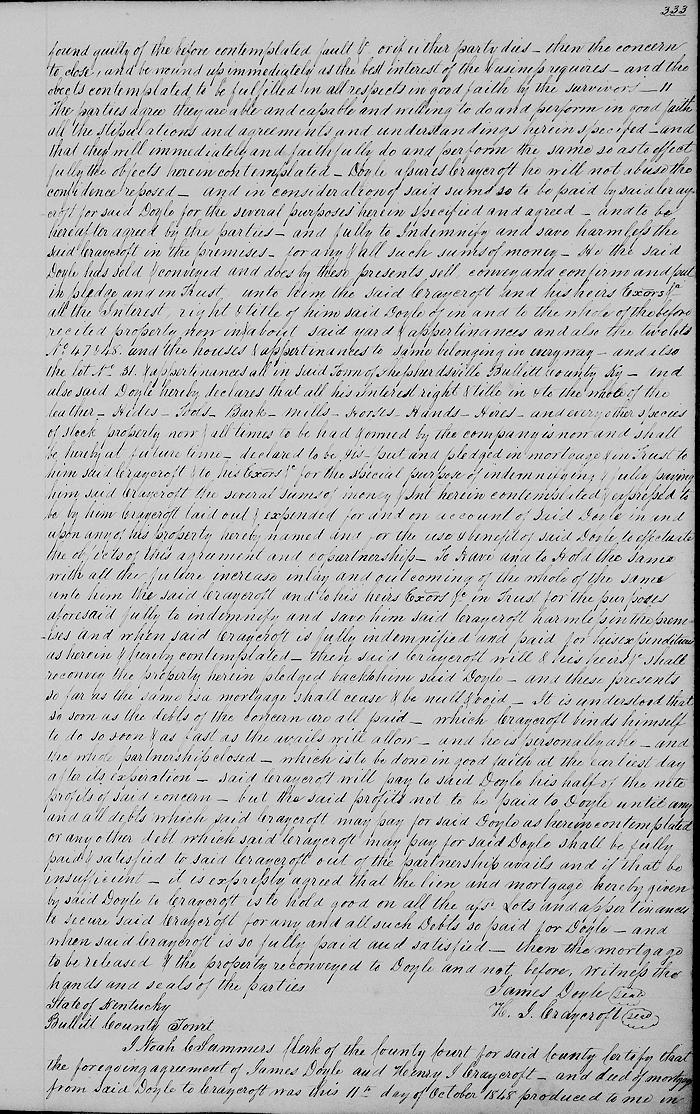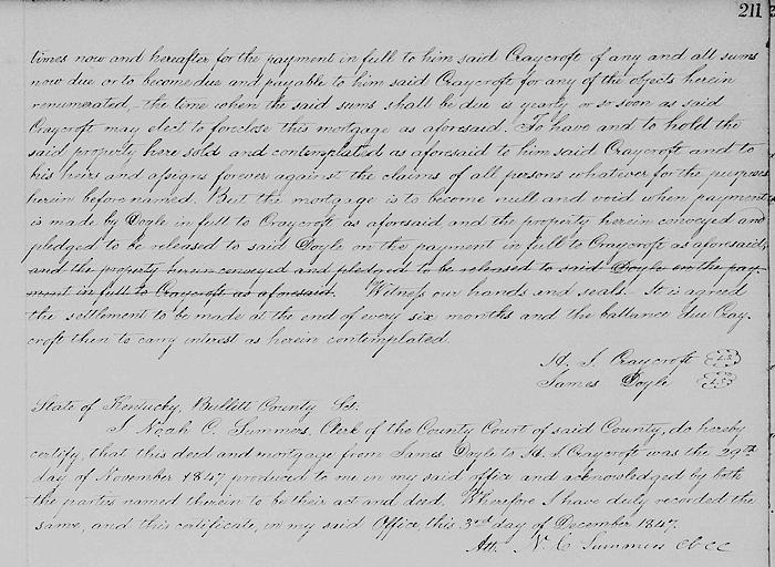 State of Kentucky, Bullitt County to-wit. I Noah C. Summers, clerk of the county court for said county, certify that the foregoing agreement of James Doyle and Henry J. Craycroft, and deed of mortgage from said Doyle to Craycroft was this 11th day of October 1848 produced to me in my office and acknowledged by said James Doyle and Henry J. Craycroft, parties thereto, to be their act and deed, and by them ordered to be recorded; and thereupon the same and this certificate are truly recorded in my office this 31 day of October 1848. Att. N. C. Summers, Clerk
