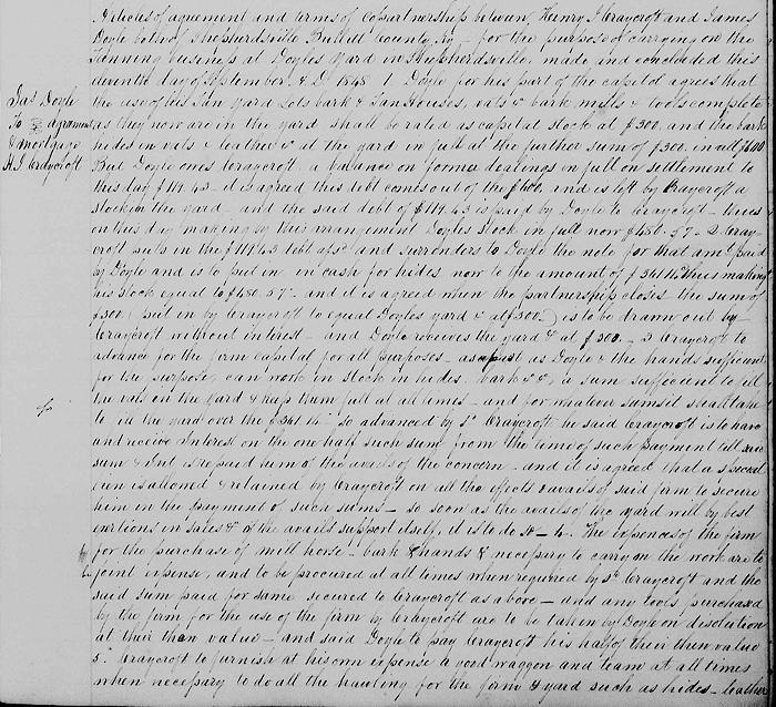 Articles of agreement and terms of copartnership between Henry J. Craycroft and James Doyle, both of Shepherdsville, Bullitt County, Kentucky, for the purpose of carrying on the tanning business at Doyle's yard in Shepherdsville, made and concluded this eleventh day of September A.D. 1848.