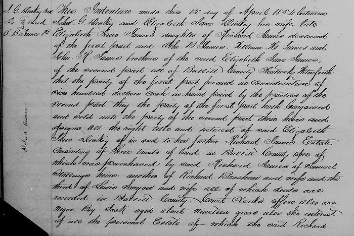 Witnesseth that the party of the first part for and in consideration of $600 cash in hand paid by the parties of the second part, they the party of the first part hath bargained and sold unto the party of the second part, their heirs and assigns all the right, title and interest of said Elizabeth Jane Dickey of in and to her father Richard James' estate consisting of three tracts of land in Bullitt County aforesaid of which was purchased by said Richard James of Samuel Stallings' heirs, another of Richard Brashear and wife, and the third of Lewis Smyser and wife, all of which deeds are recorded in Bullitt County clerk's office; also one negro boy Jack, aged about 19 years; also the interest of all the personal estate of which the said Richard James died seized and possessed and including the property now in the possession of Mary James, widow of said Richard James dec'd including all the rents and hires of said Elizabeth Jane's interest in said estate, said interest here sold is undivided and being one-seventh part of said estate.