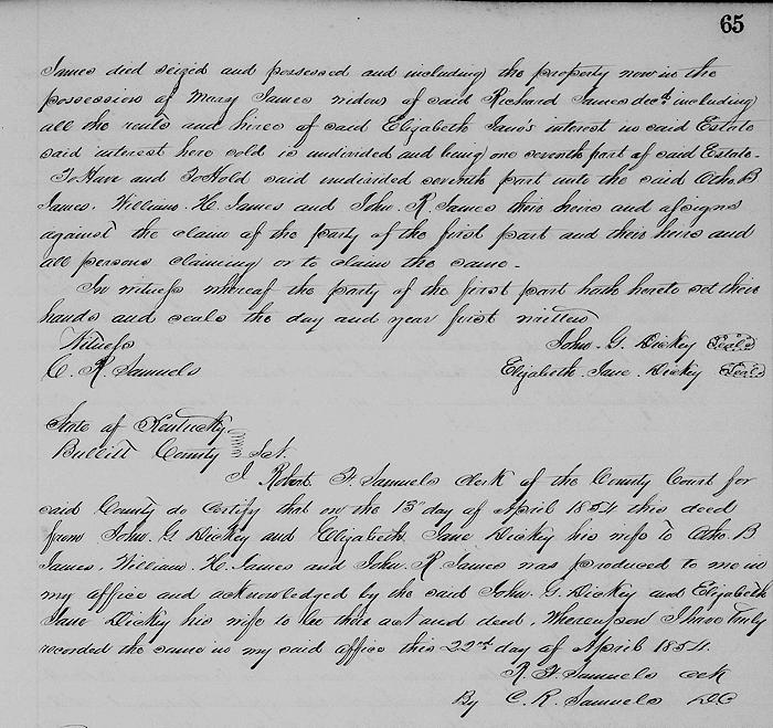 This indenture made this 12th day of April 1854 between John G. Dickey and Elizabeth Jane Dickey his wife, late Elizabeth Jane James, daughter of Richard James dec'd of the first part and Otho B. James, William H. James and John R. James, brothers of the said Elizabeth Jane James of the second part, all of Bullitt County, Kentucky.