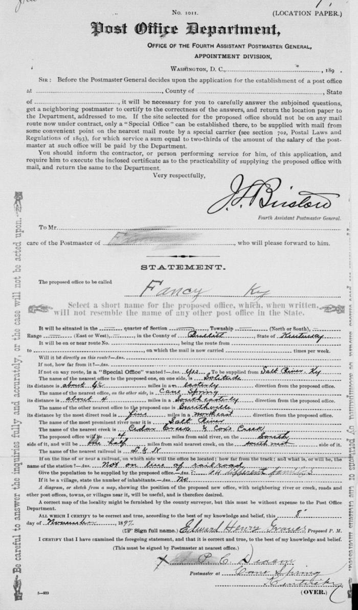 On 8 Nov 1897, Edward Henry Graves completed an application to the U.S. Post Office Department for a new post office to serve 64 families in a rural part of Bullitt County. The community was known by the name Fancy.