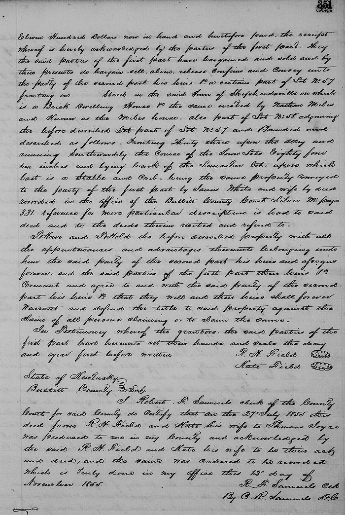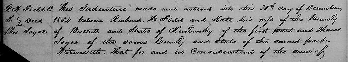 This indenture made and entered into this 30th day of December 1854 between Richard H. Field and Kate his wife of the county of Bullitt and state of Kentucky of the first part and Thomas Joyce of the same county and state of the second part.
