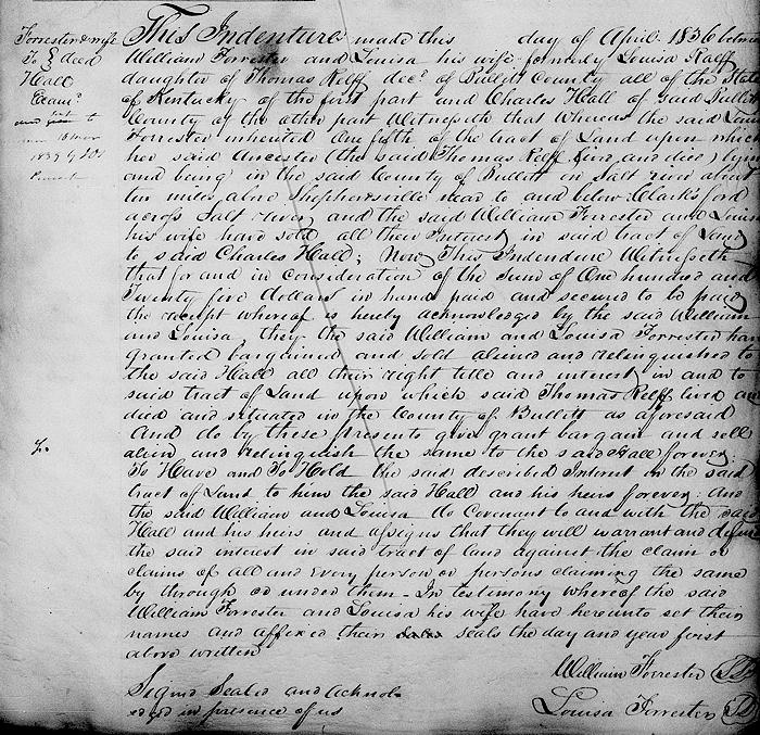 This indenture made this __ day of April 1836 between William Forrester and Louisa his wife, formerly Raeff, daughter of Thomas Relff dec'd of Bullitt County, all of the state of Kentucky of the first part and Charles Hall of said Bullitt County of the other part.