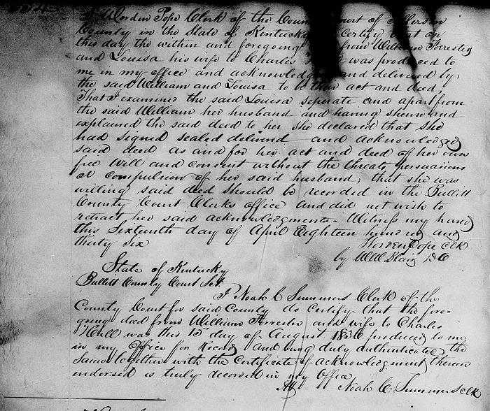 Witnesseth that whereas the said Louisa Forrester inherited one-fifth of the tract of land upon which her said ancestor (the said Thomas Relff lived and died) lying and being in the said county of Bullitt on Salt River about ten miles above Shepherdsville near to and below Clark's Ford across Salt River and the said William Forrester and Louisa his wife have sold all their interest in said tract of land to said Charles Hall.