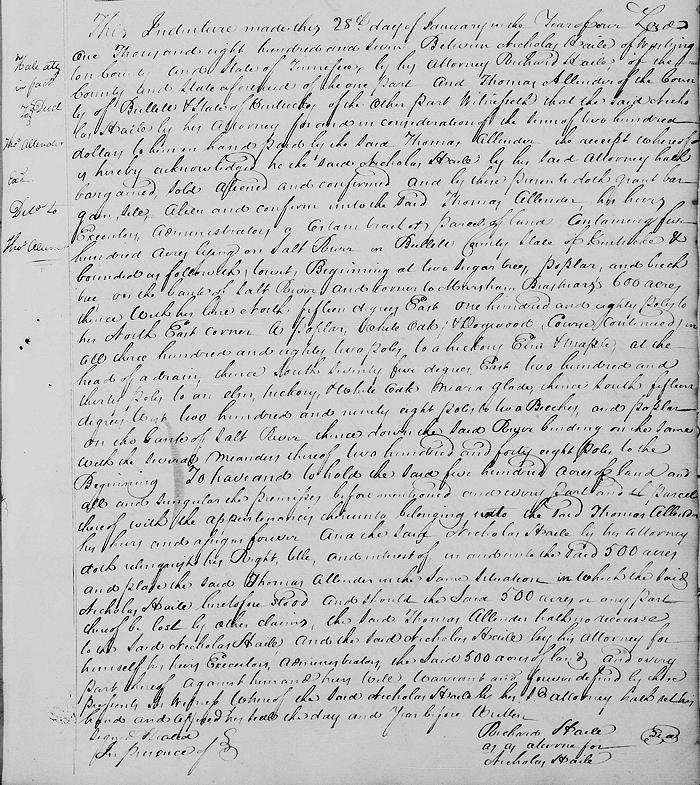 This indenture made this 28th day of January in the year of our Lord 1807 between Nicholas Haile of Washington County and state of Tennessee by his attorney Richard Haile of the county and state aforesaid of the one part, and Thomas Allender of the county of Bullitt and state of Kentucky of the other part.