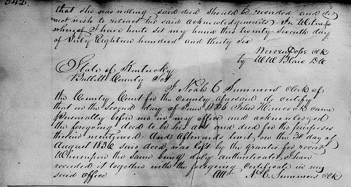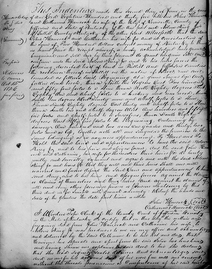 This indenture made the second day of June in the year of our Lord 1835 between John Hancock and Catherine Hancock his wife of the city of Louisville, county of Jefferson, and state of Kentucky of the one part and Nelson King Jr. of Bullitt County, Kentucky of the other part.