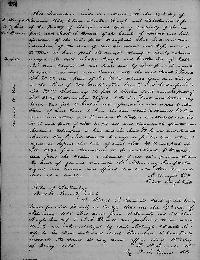 Witnesseth that for and in consideration of the sum of $150 to them in hand paid, the receipt whereof is hereby acknowledged the said Austin Hough and Tabitha his wife hath this day bargained and sold and by these presents do grant, bargain and sell and convey unto the said Jacob N. Boswell Lot No. 78 and part of Lot No. 74 situate lying and being in the town of Mt. Washington, county and state aforesaid Lot No. 78 containing 84'10" front and the part of Lot No. 74 containing 23'7" and both running back 247'6" and reference is also made to the plat of said town to him the said Jacob N. Boswell, his heirs administrators and executors &c.