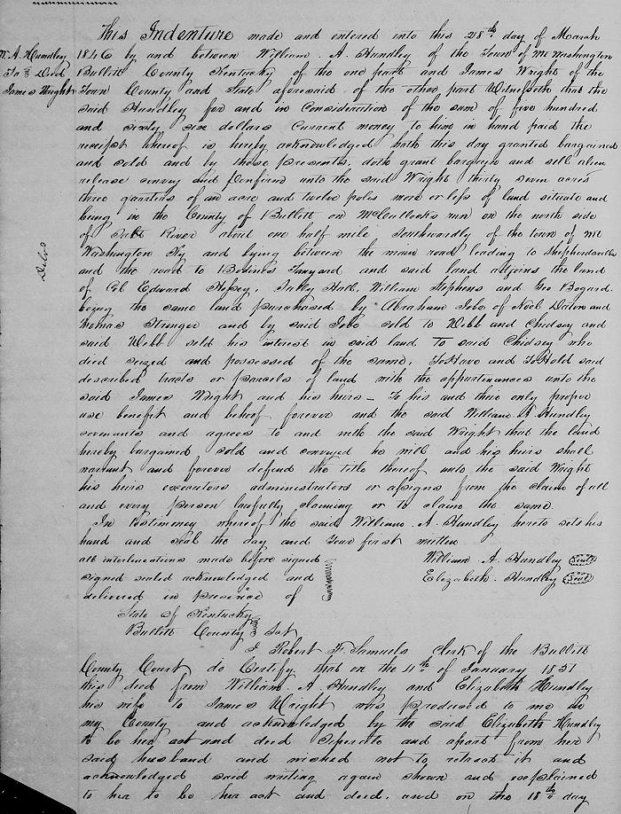 This indenture made and entered into this 28th day of March 1846 by and between William A. Hundley of the town of Mt. Washington, Bullitt County, Kentucky of the one part and James Wright of the town, county and state aforesaid of the other part.