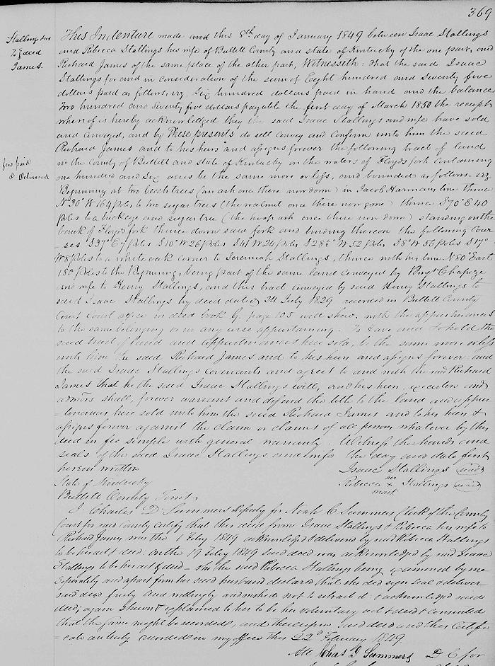 This indenture made this 8th day of January 1849 between Isaac Stallings and Rebecca Stallings his wife of Bullitt County and state of Kentucky of the one part and Richard James of the same place of the other part.