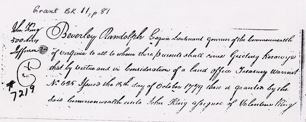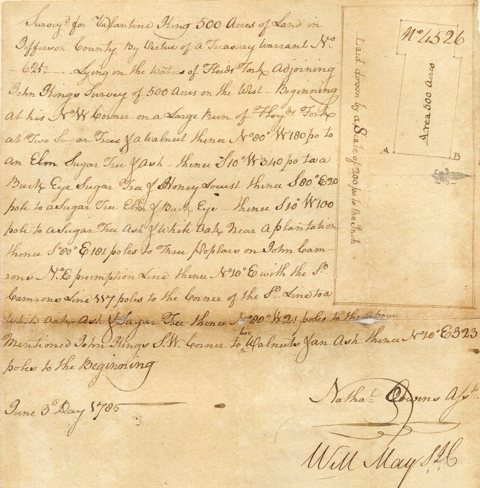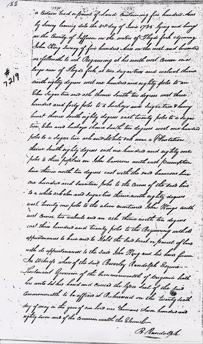 Beverley Randolph Esquire, Lieutenant Governor of the Commonwealth of Virginia to all to whom these presents shall come, greeting. Know ye that by virtue and in consideration of a land office treasury warrant number 625 issued the 15th day of October 1779 there is granted by the said Commonwealth unto John King, assignee of Valentine King, a certain tract or parcel of land containing 500 acres by survey bearing date the 3rd day of June 1785, lying and being in the county of Jefferson on the waters of Floyd's Fork adjoining John King's survey of 500 acres on the west and bounded as followeth to wit.