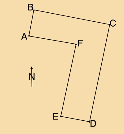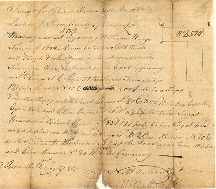 Surveyed for William Owens 400 acres of land in Jefferson County by virtue of a treasury warrant No. 1392 adjoining William King's survey of 1000 acres between Salt River and Floyd's Fork adjoining the above mentioned survey on the north and on the east, beginning on said King's southeast line at [A] two sugar trees and a poplar, thence North 10° East 100 poles to [B] a sugar tree, mulberry and walnut, thence South 80° East 300 poles to [C] a buckeye, elm and ash, thence South 10° West 384 poles to [D] two sugar trees and a walnut, thence North 80° West 120 poles to [E] two sugar trees and a poplar on William King's southwest line, thence North 10° East with said line to [F] the corner 284 poles to a sugar, walnut and elm, thence North 80° West 180 poles to the beginning. June 2, 1785. Nathaniel Owen, surveyor