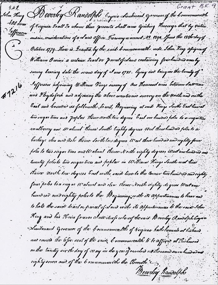 Beverley Randolph Esquire, Lieutenant Governor of the Commonwealth of Virginia to all to whom these presents shall come, greeting. Know ye that by virtue and in consideration of a land office treasury warrant number 1392 issued the 18th day of October 1779 there is granted by the said Commonwealth unto John King, assignee of William Owens, a certain tract or parcel of land containing 400 acres by survey bearing date the 2nd day of June 1785, lying and being in the county of Jefferson adjoining William King's survey of 1000 acres between Salt River and Floyd's fork and adjoining the above mentioned survey on the north and on the east and bounded as followeth to wit.