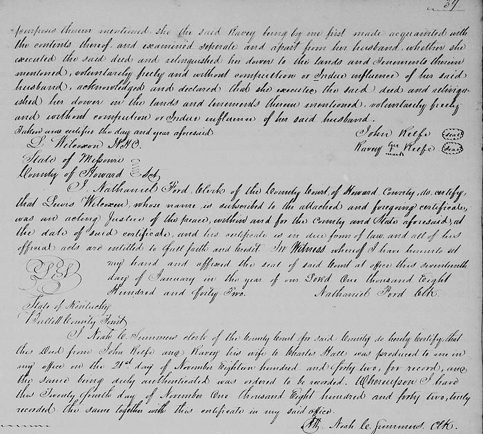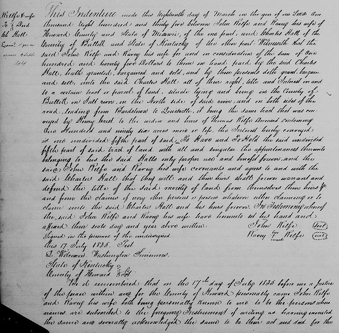 This indenture made this 18th day of March in the year of our Lord 1835 between John Relfe and Ravey his wife of Howard County and state of Missouri of the one part, and Charles Hall of the county of Bullitt and state of Kentucky of the other part.