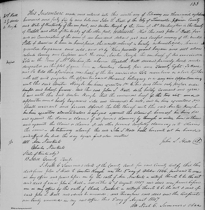 This indenture made and entered into this ninth day of February 1846 by and between John S. Hall of the city of Louisville, Jefferson County, and state of Kentucky of the one part, and Austin Hough of the town of Mount Washington, and the county of Bullitt and state of Kentucky of the other part.