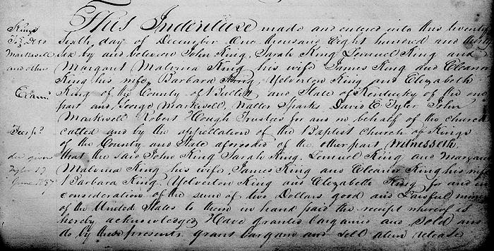 This indenture made and entered into this 26th day of December 1836 by and between John King, Sarah King, Lemuel King and Margaret Malvina King his wife, James King and Eleanor King his wife, Barbara King, Yelverton King and Elizabeth King of the county of Bullitt and state of Kentucky of the one part and George Markwell, Walter Sparks, David E. Tyler, John Markwell, Robert Hough, trustees for and on behalf of the church called and by the appellation of the Baptist Church of Kings of the county and state aforesaid of the other part.