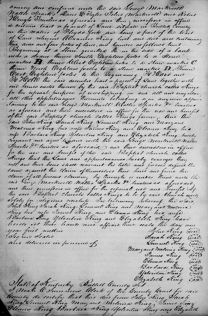 Witnesseth that the said John King, Sarah King, Lemuel King and Margaret Malvina King his wife, James King and Eleanor King his wife, Barbara King, Yelverton King and Elizabeth King for and in consideration of the sum of two dollars good and lawful money of the United States to them in hand paid, the receipt whereof is hereby acknowledged, have granted, bargained and sold, and do by these presents grant, bargain and sell, alien, release, convey and confirm unto the said George Markwell, Walter Sparks, David E. Tyler, John Markwell and Robert Hough, trustees as aforesaid, and their successors in office a certain tract or parcel of land situate in Bullitt County on the waters of Floyd's Fork, and being a part of the tract of land whereon Alexander King lived and died, and containing two acres and four poles of land, and bounded as follows, to-wit.