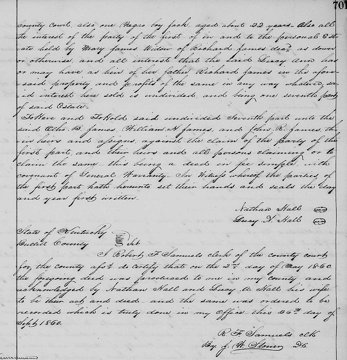 Witnesseth that the party of the first part for and in consideration of $800 secured to be paid by note of even date hereof given due they the party of the first part hath granted, bargained and sold unto the party of the second part, their heirs and assigns all the right, title and interest of the said Lucy Ann Hall of in and to her father Richard James' estate consisting of four tracts of land in Bullitt County; one of which was purchased by said Richard James of Samuel Stallings' heirs, another of Richard Brashear and wife, a third tract of Lewis Smyser and wife, all of which deeds are of record in the clerk's office of Bullitt County Court. Also one negro boy Jack, aged about 22 years. Also all the interest of the party of the first of in and to the personal estate held by Mary James, widow of Richard James dec'd as dower or otherwise, and all interest that the said Lucy Ann has or may have as heir of her father Richard James in the aforesaid property and profits of the same in any way whatever. Said interest here sold is undivided and being one-seventh part of said estate.
