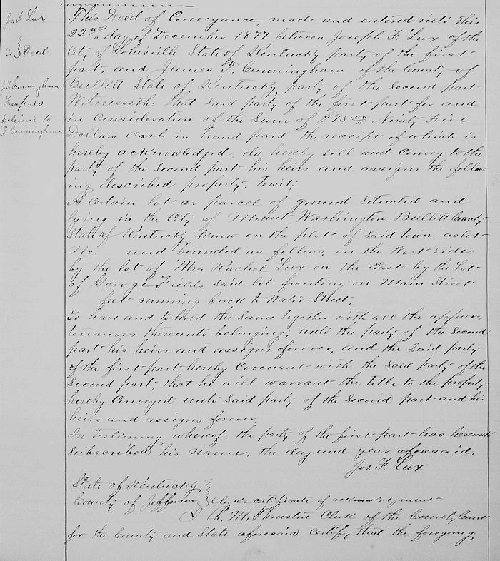 This deed of conveyance made and entered into the 22nd day of December 1877 between Joseph F. Lux of the city of Louisville, state of Kentucky, party of the first part, and James T. Cunningham of the county of Bullitt, state of Kentucky, party of the second part.
