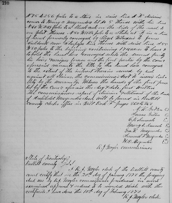 Witness the hands of the first parties by the commissioner aforesaid, the day and date first written. The commissioner's report of division and allotment of the lands of Archibald Magruder dec'd will be found in Bullitt County Clerk's office in Will Book F, pages 360-363. (Signed by commissioner for grantors on 20 Jan 1873.)
