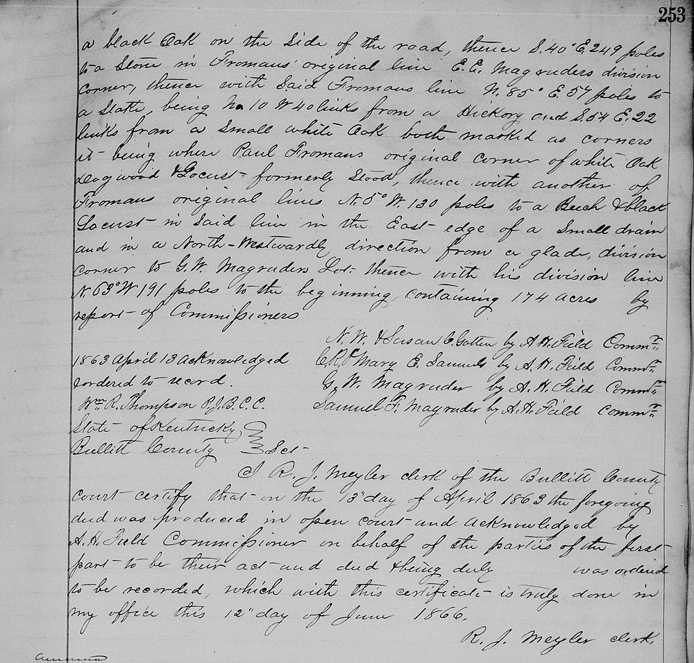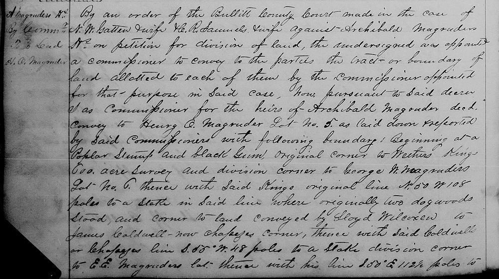 Now pursuant to said decree as commissioner for the heirs of Archibald Magruder dec'd convey to Henry O. Magruder, lot No. 5 as laid down & reported by said commissioners with following boundary: Beginning at a poplar stump and black gum, original corner of Withers King's 600 acre survey and division corner to George W. Magruder's lot No. 6, thence with said King's originally two dogwoods stood, and corner to land conveyed by Lloyd Wilcoxen to James Caldwell, now Chapeze's corner, thence with said Caldwell or Chapeze's line S 55° W 48 poles to a stake, division corner to E. E. Magruder's lot, thence with his line S 50° E 112 1/2 poles to a black oak on the side of the road, thence S 40° E 249 poles to a stone in Froman's orignial line, E. E. Magruder's division corner, thence with said Froman's line N 85° E 57 poles to a stake, being N 10° W 40 links from a hickory and S 54° E 22 links from a small white oak, both marked as corners, it being where Paul Froman's original corner of white oak, dogwood & locust formerly stood, thence with another of Forman's original lines N 5° W 130 poles to a beech & black locust in said line on the east edge of a small drain and in a northwestwardly direction from a glade division corner to G. W. Magruder's lot, thence with his division line N 63° W 191 poles to the beginning containing 174 acres by report of commissioners.