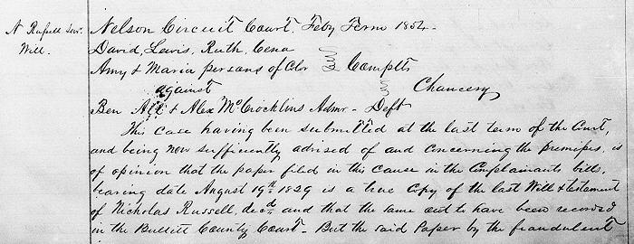 Nicholas Russell made his will in 1829, but it was not recorded in the will book until 1854 due to the "fraudulent conduct" of some of his heirs. It was finally recorded at the order of the Nelson County Circuit Court due to a case brought before it regarding the freedom of six persons of color who were attempting to obtain the freedom promised them in his will.