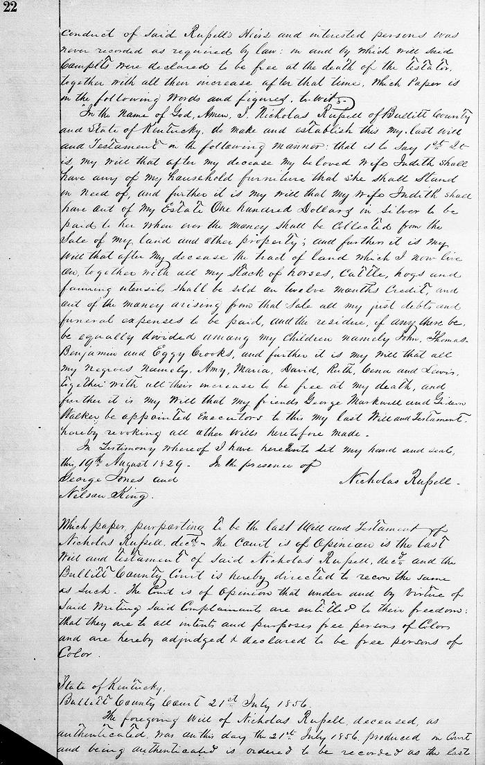 "In the name of God, Amen. I Nicholas Russell of Bullitt County and State of Kentucky, do make and establish this my last will and testament in the following manner; that is to say 1st, it is my will that after my decease my beloved wife Judith shall have any of my household furniture that she shall stand in need of, and further it is my will that my wife Judith shall have out of my estate $100 in silver to be paid to her whenever the money shall be collected from the sale of my land and other property. And further it is my will that after my decease the tract of land which I now live on, together with all my stack of horses, cattle, hogs and farming utensils shall be sold on twelve months credit, and out of the money arising from that sale all my just debts and funeral expenses to be paid, and the residue, if any there be, be equally divided among my children, namely John, Thomas, Benjamin and Eggy Crooks, and further it is my will that all my negroes, namely Amy, Maria, David, Ruth, Cena and Lewis, together with all their increase to be free at my death, and further it is my will that my friends George Markwell and Gideon Walker be appointed executors to this my last will and testament, hereby revoking all other wills heretofore made. In testimony whereof I have hereunto set my hand and seal this 19th August 1829. In presence of George Jones and Nelson King. (signed) Nicholas Russell"