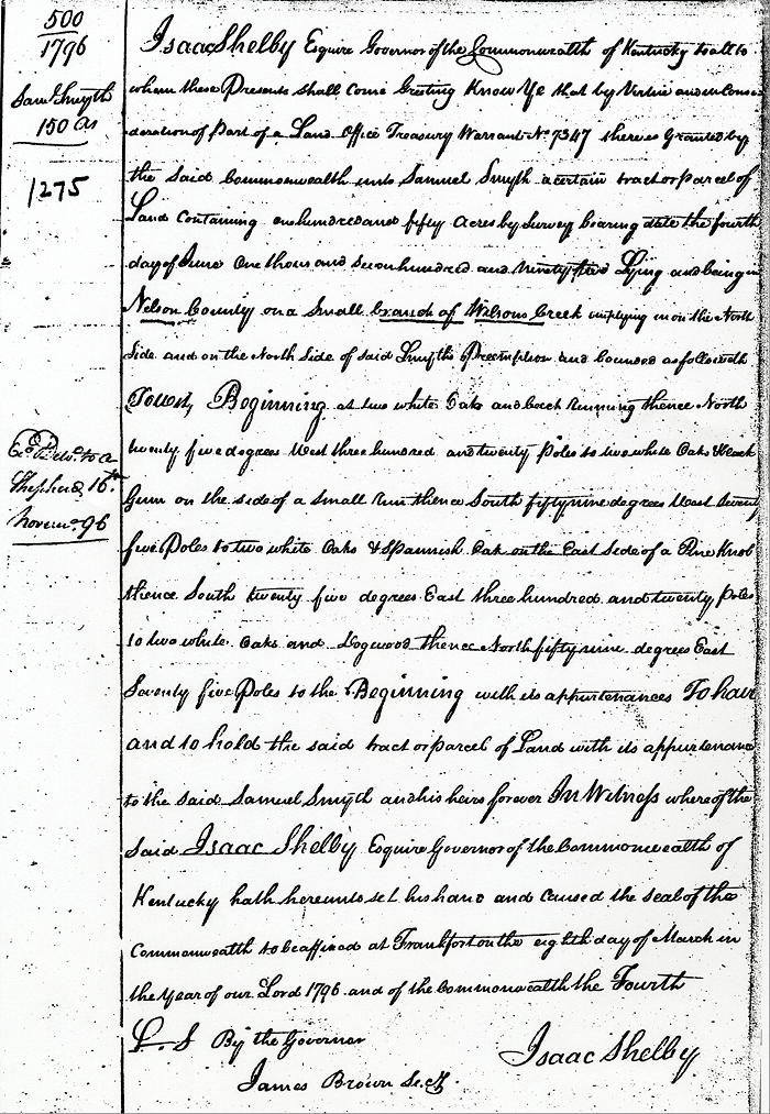 To have and to hold the said tract or parcel of land with its appurtenances to the said Samuel Smyth and his heirs forever. In witness whereof the said Isaac Shelby Esquire, Governor of the Commonwealth of Kentucky, hath hereunto set his hand and caused the seal of the Commonwealth to be affixed at Frankfort on the 8th day of March in the year of our Lord 1796, and of the Commonwealth the fourth. (signed) Isaac Shelby