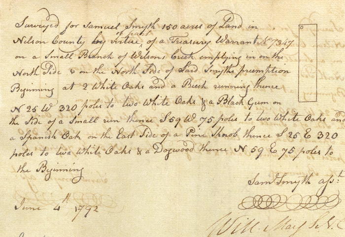 Isaac Shelby Esquire, Governor of the Commonwealth of Kentucky, to all to whom these presents shall come, greeting. Know ye that by virtue and in consideration of part of a land office treasury warrant No. 7347, there is granted by the said Commonwealth unto Samuel Smyth a certain tract or parcel of land containing 150 acres by survey bearing date the 4th day of June 1792, lying and being in Nelson County on a small branch of Wilson's Creek emptying in on the north side and on the north side of said Smyth's preemption and bounded as followeth, to wit.