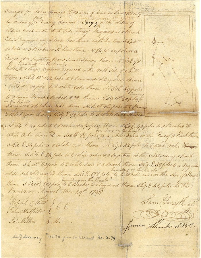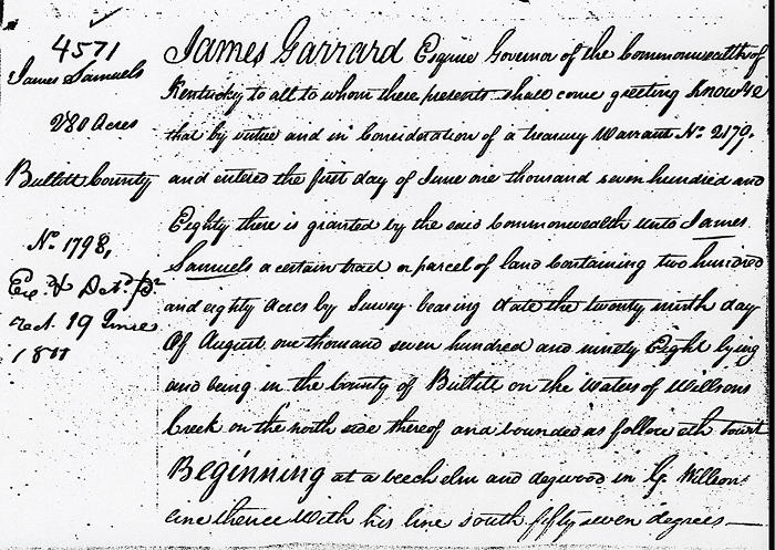 James Garrard Esquire, Governor of the Commonwealth of Kentucky, to all to whom these presents shall come, greeting. Know ye that by virtue and in consideration of part of a land office treasury warrant No. 2179, and entered the first day of June 1780, there is granted by the said Commonwealth unto James Samuels a certain tract or parcel of land contaiing 280 acres by survey bearing date the 29th day of August 1798, lying and being in the county of Bullitt on the waters of Wilson's Creek, on the north side thereof, and bounded as followeth, to wit.