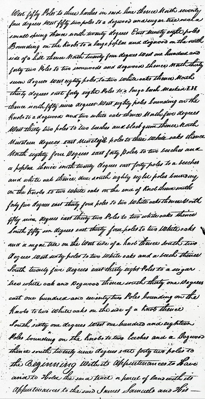 Beginning at a beech, elm and dogwood in George Willson's line, thence with his line South 57° West 50 poles to three beeches in said line, thence North 74° West 52 poles to a dogwood and sugar tree near a small spring, thence North 20° East 98 poles bounding on the knobs to a large poplar and dogwood on the north side of a hill, thence North 24° West 142 poles to two ironwoods and dogwood, thence North 37° West 80 poles to two white oaks, thence North 30° East 48 poles to a large beech marked I H, thence North 59° West 80 poles bounding on the knobs to a dogwood and two white oaks, thence North 5° West 32 poles to two beeches and black gum, thence North 19° East 90 poles to three white oaks, thence North 84° East 40 poles to two beeches and a poplar, thence South 20° East 40 poles to a beech and white oak, thence due South 88 poles bounding on the knobs to two white oaks on the end of knob, thence South 45° East 34 poles to two white oaks, thence North 59°East 32 poles to two white oaks, thence South 56° East 34 poles to two white oaks and a sugar tree on the west side of a knob, thence South 2° West 60 poles to two white oaks and a beech, thence South 25° East 38 poles to a sugar tree, white oak and dogwood, thence South 31° East 172 poles bounding on the knobs to two white oaks on the side of a knob, thence South 61° West 118 poles bounding on the knobs to two beeches and a dogwood, thence South 29° East 42 poles to the beginning with its appurtenances.