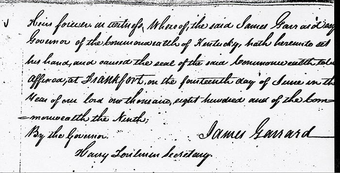 To have and to hold the said tract or parcel of land with its appurtenances to the said James Samuel and his heirs forever. In witness whereof the said Isaac Shelby Esquire, Governor of the Commonwealth of Kentucky, hath hereunto set his hand and caused the seal of the Commonwealth to be affixed at Frankfort on the 14th day of June in the year of our Lord 1800, and of the Commonwealth the ninth. (signed) James Garrard