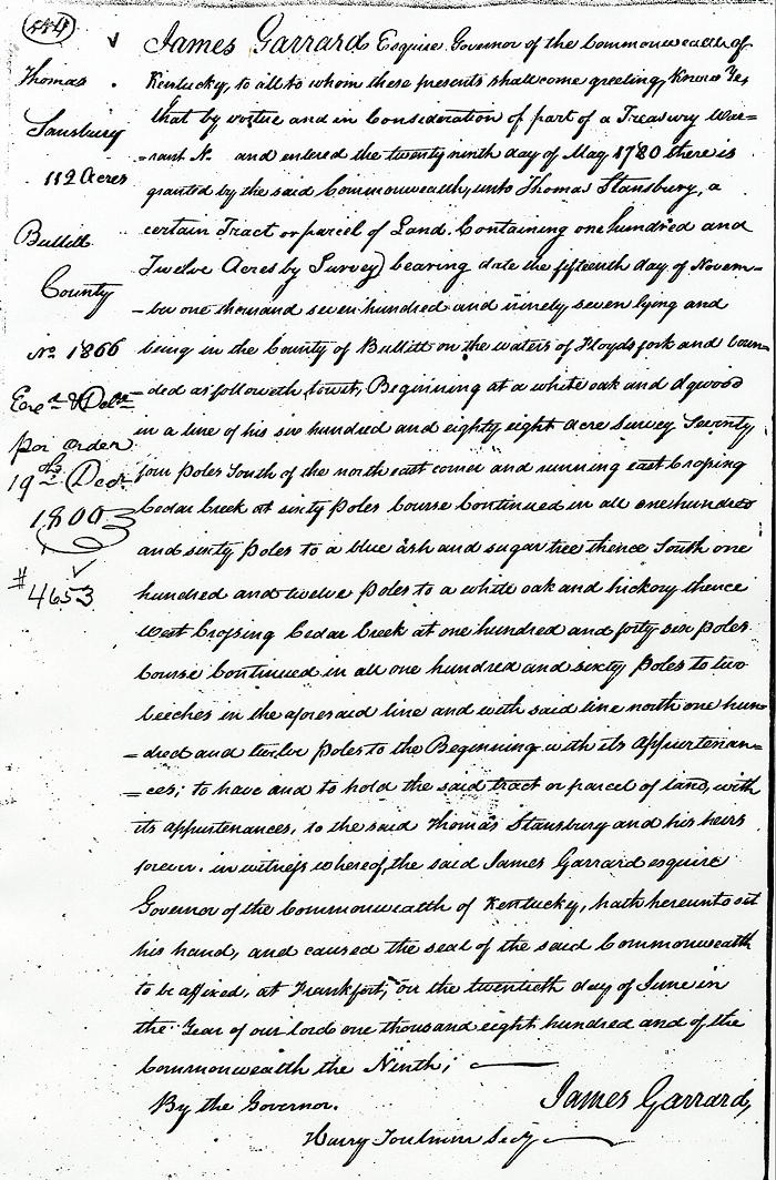James Garrard, Esquire, Governor of the Commonwealth of Kentucky, to all to whom these presents shall come, greeting. Know ye that by virtue and in consideration of a part of a treasury warrant No. __, and entered the 29th day of May 1780, there is granted by the said Commonwealth unto Thomas Stansbury, a certain tract or parcel of land containing 112 acres by survey bearing date the 15th day of November 1797, lying and being in the county of Bullitt on the waters of Floyd's Fork, and bounded as follows to wit.