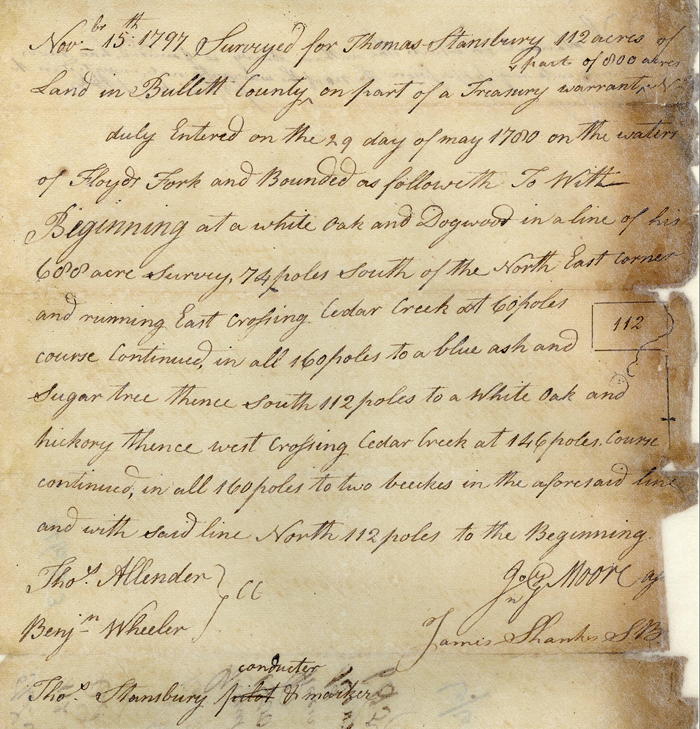 November 15, 1797. Survey for Thomas Stansbury 112 acres of land in Bullitt County on part of a treasury warrant number __ duly entered on the 29th day of May 1780 on the waters of Floyd's Fork and bounded as follows to wit.