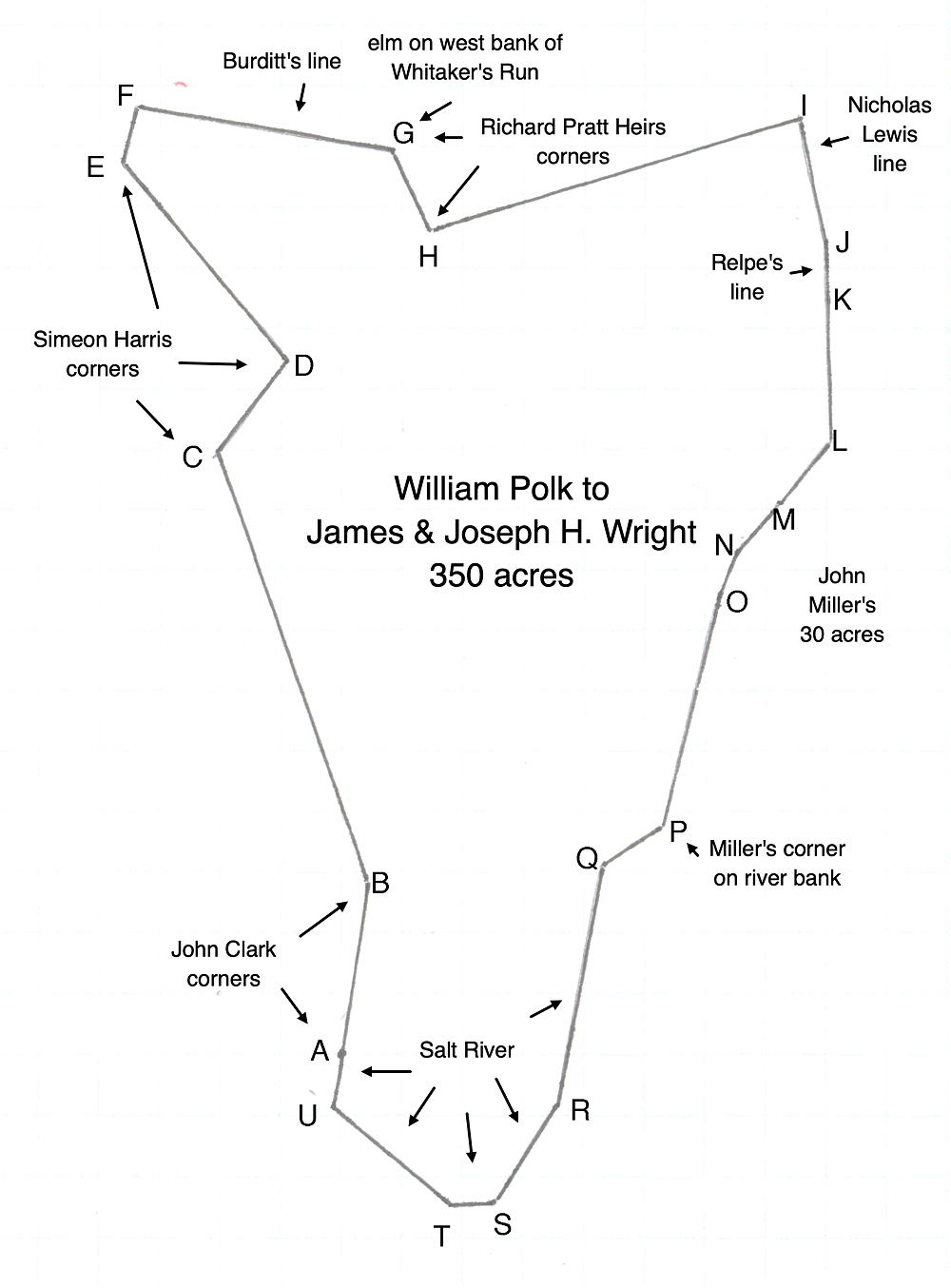 Beginning at [A] two maples on the bank of Salt River, corner to Clark's, thence with his line North 8° East for 6° 62 1/2 poles to at [B] a stake, Clark's corner, originally 2 sycamores, thence North 18 3/4° West for 20° 172 poles to at [C] a white oak stump on the top of a ridge, corner to Simeon Harris, thence with his line North 36 1/4° East for 30° 43 poles, 10 links to at [D] two black walnuts on the south side of a drain and corner to Harris, thence with his line North 41° West 98 1/4° poles to at [E] a stake and white oak, corner to Harris, thence North 11° East (for 16°) 20 1/2 poles to at [F] a stake, originally a beech in Burditt's line, thence with his line South 80 1/2° East 98 1/4 poles to at [G] an elm on the west bank of Whitaker's Run and corner to Richard Pratt's heirs, thence with their line South 26 1/4° East 33 poles to at [H] a stone, corner to said heirs, thence with their line North 72 3/4° East 153 3/4 poles to [I] a stone in Nicholas Lewis' line of his 1000 acres, thence Lewis' line South 11 1/2° East for 10° 49 poles to at [J] a stake in Raeplis' line and on the south side of a drain, thence with Raeplis' line South 2° East 76 poles to at [K] a stake in said line, thence 37 1/2° West 2 1/2 poles to at [L] a beech, corner to Miller's 30 acres, thence with Miller's line South 37 1/2° West 26 poles to at [M] a stake, thence with Miller's line South 41° West 23 poles, at [N] South 20 1/2° West 19 poles, at [O] South 13 1/2° West 89 poles to at [P] a stake on the bank of Salt River and corner to Miller, thence down Salt River South 56 1/2° West 27 poles, at [Q] South 10° West 90 poles, at [R] South 32° West 44 poles, at [S] South 83° West 17 poles, at [T] North 51 1/4° West 70 3/20 poles, at [U] North 8° East 5 1/2 poles to the beginning together with the privileges and appurtenances to the same belonging.