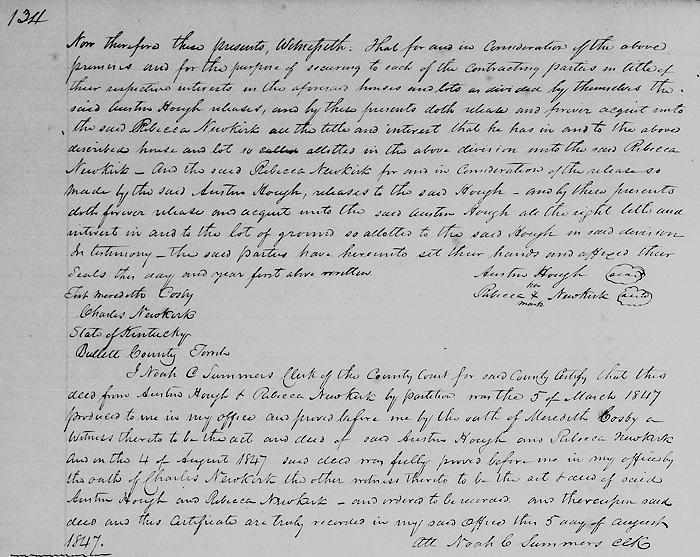 This indenture made this fifth day of December in the year of our Lord 1846 between Austin Hough and Rebecca Newkirk, both of Bullitt County and state of Kentucky.