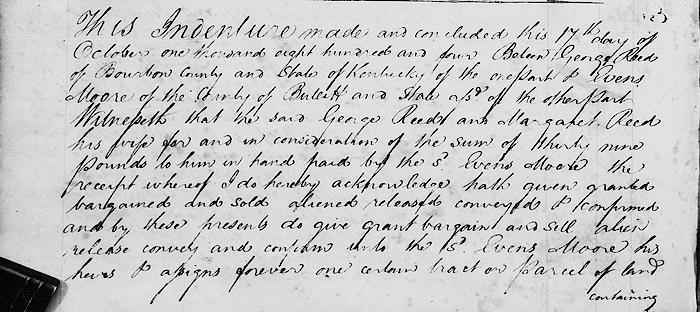 This indenture made and concluded this 17th day of October 1804 between George Reed of Bourbon County and state of Kentucky of the one part and Evans Moore of the county of Bullitt and state aforesaid of the other part.