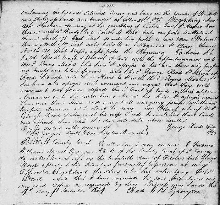 Witnesseth that the said George Reed and Margaret Reed his wife for and in consideration of the sum of 39 pounds to him in hand paid by the said Evans Moore, the receipt whereof I do hereby acknowledge, hath given, granted, bargained and sold, aliened, released, conveyed and confirmed, and by these presents do give, grant, bargain and sell, alien, release, convey and confirm unto the said Evans Moore, his heirs and assigns forever one certain tract or parcel of land containing 30 acres situated lying and being in the county of Bullitt and state aforesaid, and bounded as followeth.
