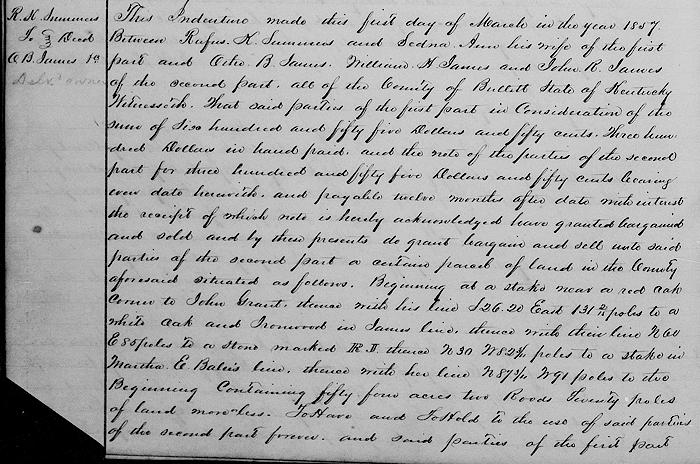 This indenture made this first day of March in the year 1857 between Rufus K. Summers and Sedna Ann his wife of the first part and Otho B. James, William H. James and John R. James the second part all of the county of Bullitt, state of Kentucky.