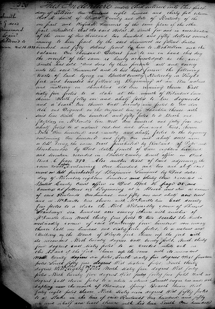 Witnesseth that the said Robert M. Smith, for and in consaideration of the sum of $2250 current money to him paid by the said Summers as follows, $1250 paid by him to M & S Willson and the balance $1000 paid to me in hand this day, the receipt of the same is hereby acknowledged, he said Smith has sold and does by these presents sell and convey unto the said Summers and to his heirs forever, the following tracts of land lying in Bullitt County, Kentucky on Floyd's Fork and bounded as follows viz.