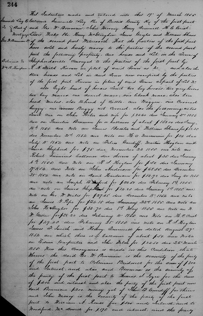 This indenture made and entered into this 19th of March 1855 between Samuels, Levy & Company of Bullitt County, Kentucky of the first part and George W. Bowman, John Mooney, Henry Trunnell, H. C. Crist, Lewis Wicks & Company, Henry McGloughin, James Crigler and William Shane of the second part.