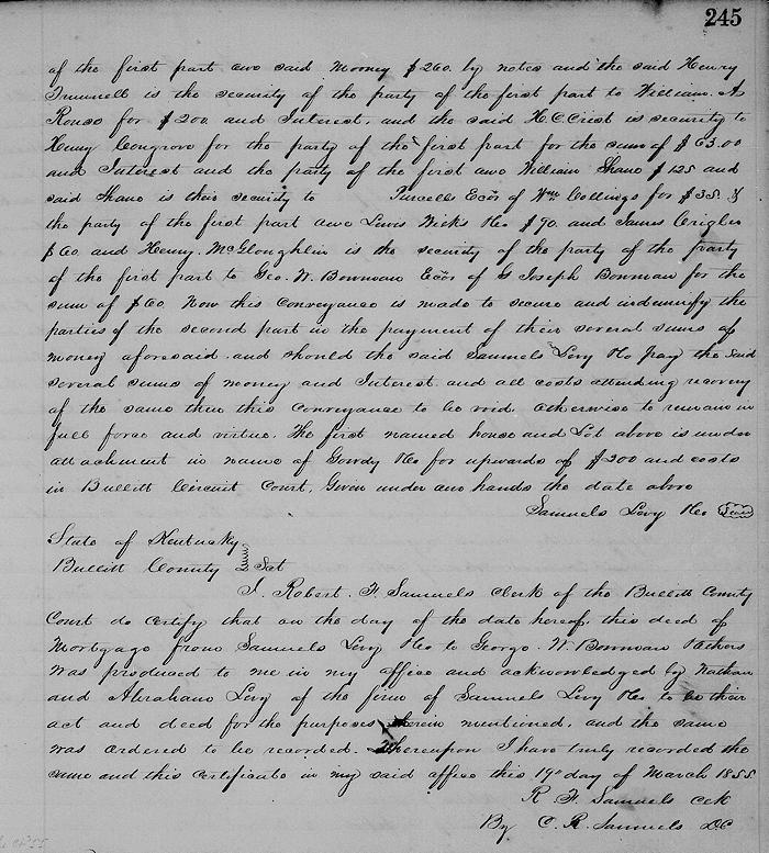 Now this conveyance is made to secure and indemnify the parties of the second part in the payment of their several sums of money aforesaid and should said Samuels, Levy and Company pay the said several sums of money and interest, and all cost attending recovery of the same then this conveyance to be void, otherwise to remain in full force and virtue. The first named house and lot above is under attachment in name of Gowdy & Company for upwards of $200 and costs in Bullitt Circuit Court. Given under our hands, the date above.